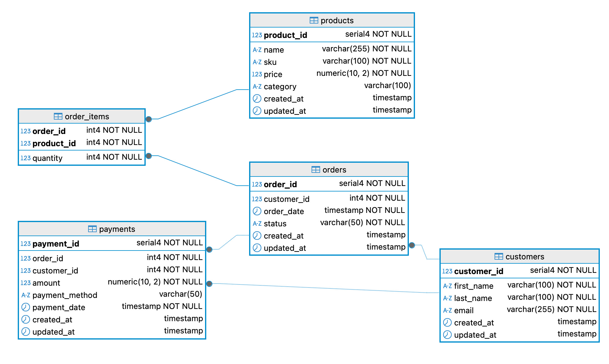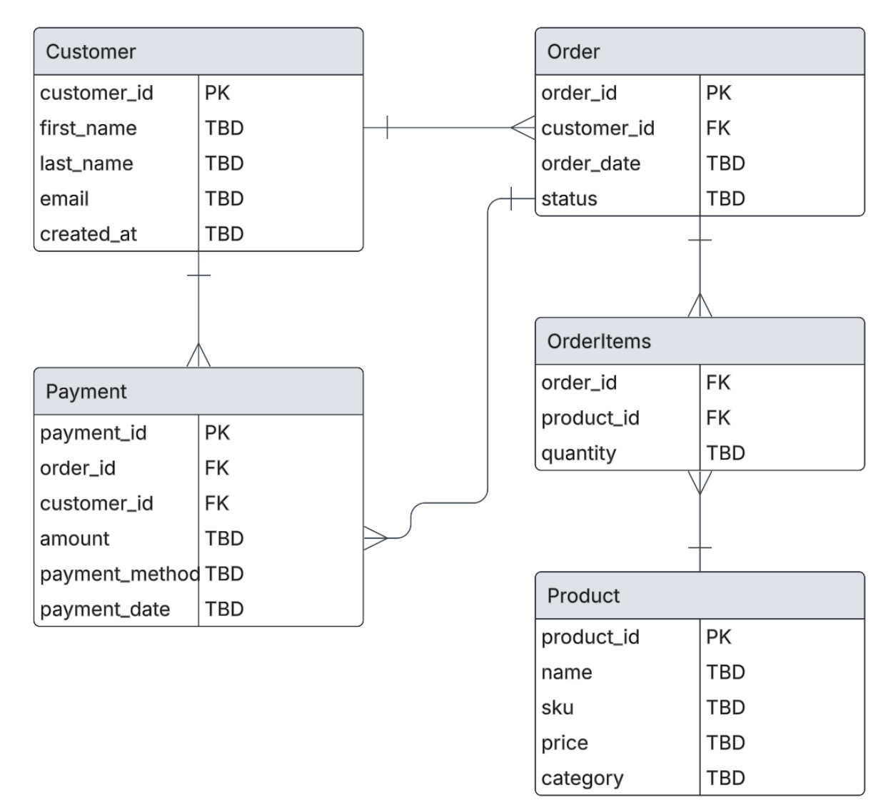 Me: Great. So just to repeat back: we’re working with customers, orders, products, and payments. How are those related?