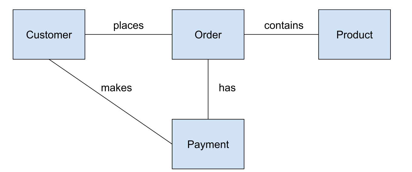 Using regular language, the nouns are the entities, and the verbs are the relationships. Let’s discuss this a bit more. In this example, we have the following entities: Customer, Order, Product, and Payment. Let’s look at the relationships between these entities. A Customer places an Order, which contains Products. An Order has a Payment associated with it.